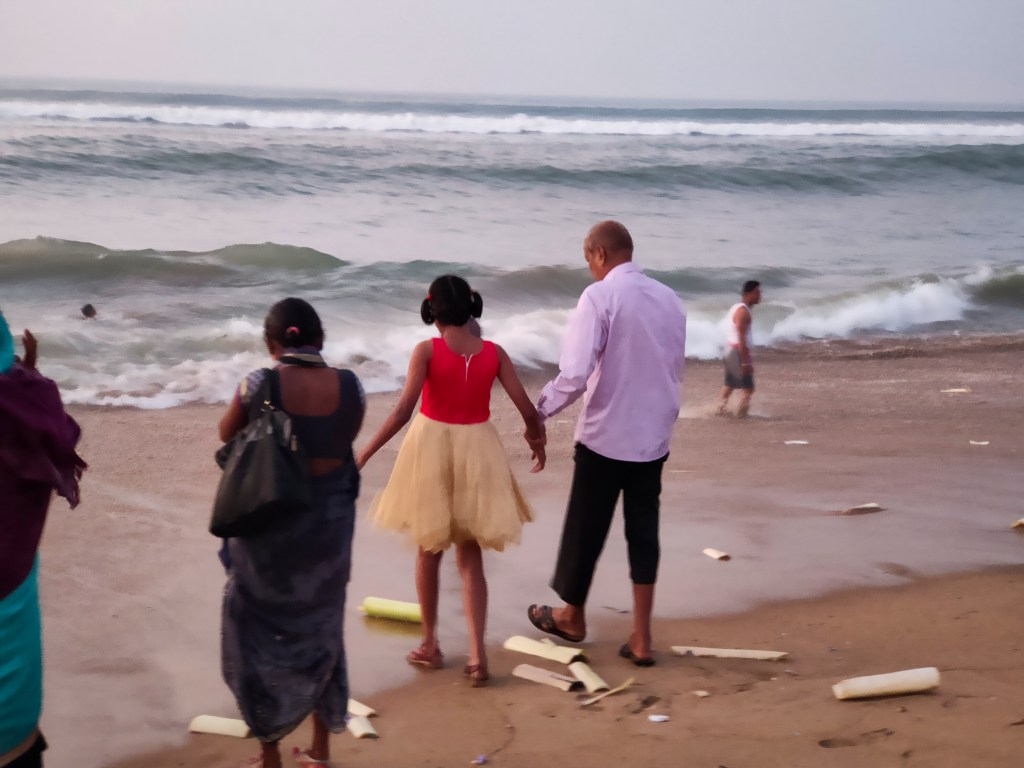 Am frühen Morgen am Strand von Puri. Die Menschen setzen kleine “Boote” – eigentlich bloss Brettchen – mit Kerzen und Götterfiguren ins Meer aus. Ich tue es auch. Aber mein Boot kentert und die Kerzen verlöschen mit der ersten kleinen Welle. Wer es etwas grösser will, entlässt einen Heissluft-Ballon in den Himmel. Manche schaffen es weit übers Meer hinaus, bevor sie im Dunst verschwinden. Was gefeiert oder welches Fest begangen wird, weiss ich nicht.