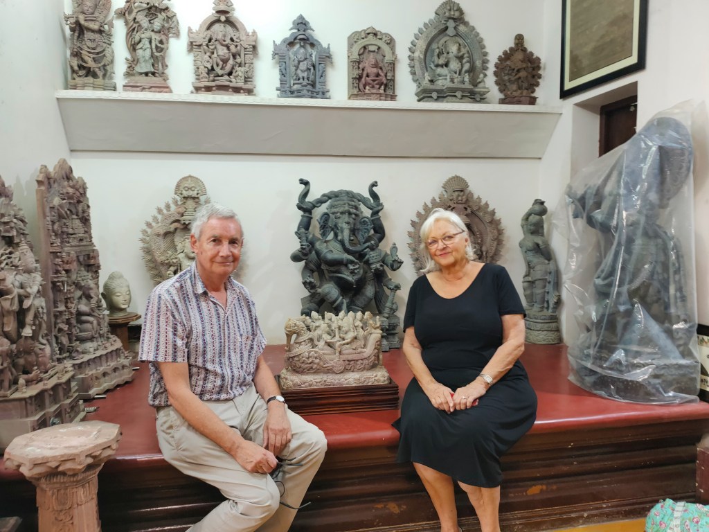 Links der Shiva, gekauft Ende November in Bombay, gegossen gemäss Händlerangabe in den vierziger Jahren des letzten Jahrhunderts, rechts der Shiva im Musée Guimet in Paris, ca. 12. Jahrhundert. Die Position ist dieselbe. Die Höhe, ca. 50 cm, ist ebenfalls fast gleich. Sie stammen beide aus der Gegen des heutigen Tamil Nadu. Die alte Bronze stammt aus dem Chola Reich.