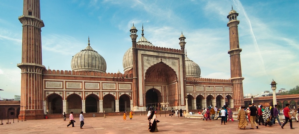 Besuch der grossen Moschee mit Yoginder. Grossartige, exotische Architektur mit den Zwiebelkuppeln aus Tausendundeinernacht.
