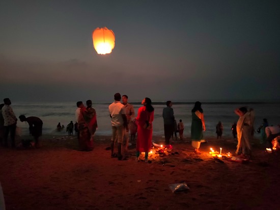 Am frühen Morgen am Strand von Puri. Die Menschen setzen kleine “Boote” – eigentlich bloss Brettchen – mit Kerzen und Götterfiguren ins Meer aus. Ich tue es auch. Aber mein Boot kentert und die Kerzen verlöschen mit der ersten kleinen Welle. Wer es etwas grösser will, entlässt einen Heissluft-Ballon in den Himmel. Manche schaffen es weit übers Meer hinaus, bevor sie im Dunst verschwinden. Was gefeiert oder welches Fest begangen wird, weiss ich nicht.