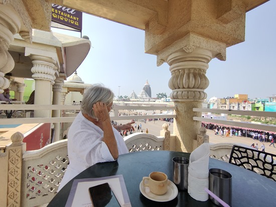 Die Pilgerinnen mit Stasi und Bubu, am Strand beim Lichterfest, noch ein Blick vom Grand Restaurant mit der Grand Road, Blick auf den majestätischen Jaganath, ein Heiliger und zwei Kunden im Chattapitri-Center.